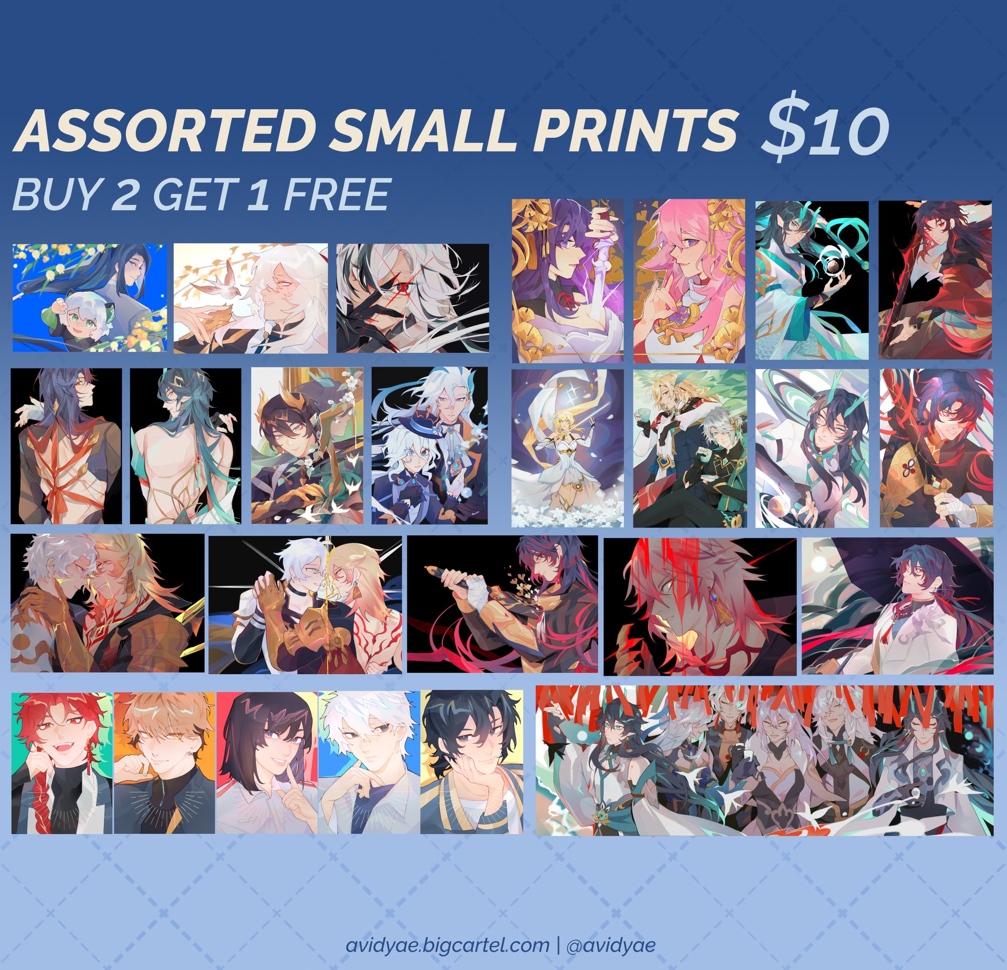 Buy 2 small prints, get 1 free! Assorted prints from HSR, Genshin Impact, Link Click, and Legend of Hei.